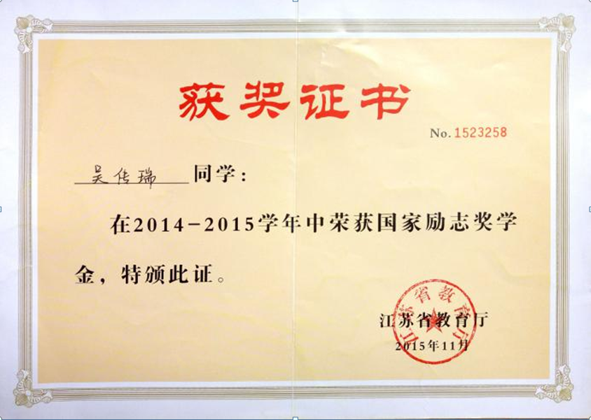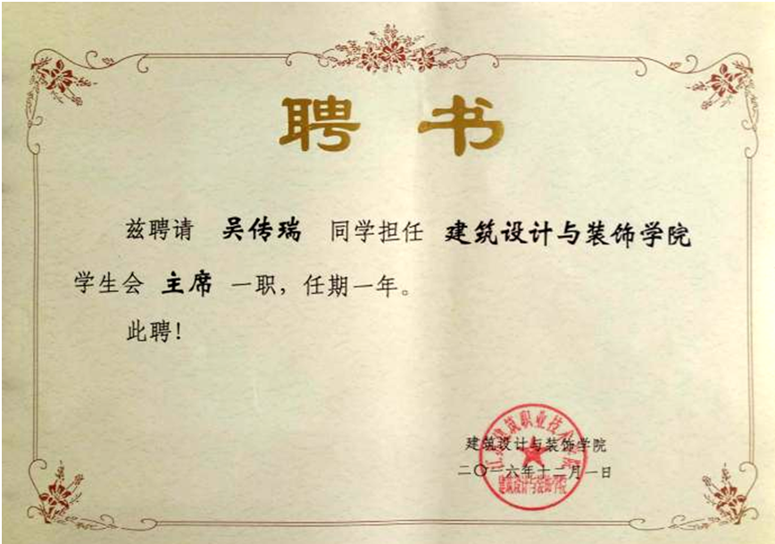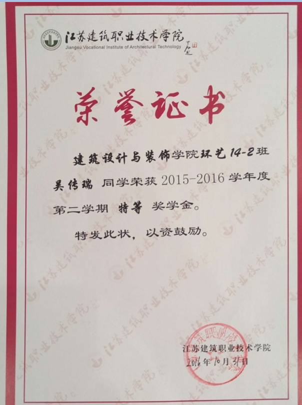 吴传瑞,男,汉族,1995年6月生,中国共产党预备党员,太阳成集团tyc建筑设计与装饰公司2014级员工,院员工会主席。曾获国家奖学金(8000元)、国家励志奖学金(5000元)、校特等奖学金三次、江苏省优秀员工干部,全国“发明杯”创新大赛一等奖。