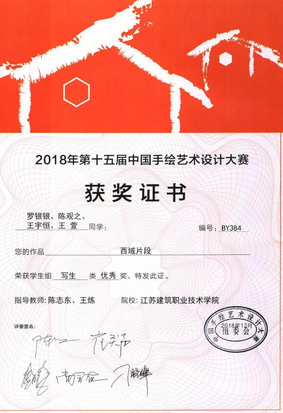 5月10日,2018中国手绘艺术设计大赛颁奖典礼暨第六届中国陈设艺术论坛在中山市星光联盟全球品牌灯饰中心隆重举行。公司手绘团队王炼、陈志东、邢洪涛作品《视觉印象》获专业组一等奖。另外,古建筑工程技术专业员工罗银银、陈观之、王宇恒、王萱作品《西域片段》获员工组优秀奖。