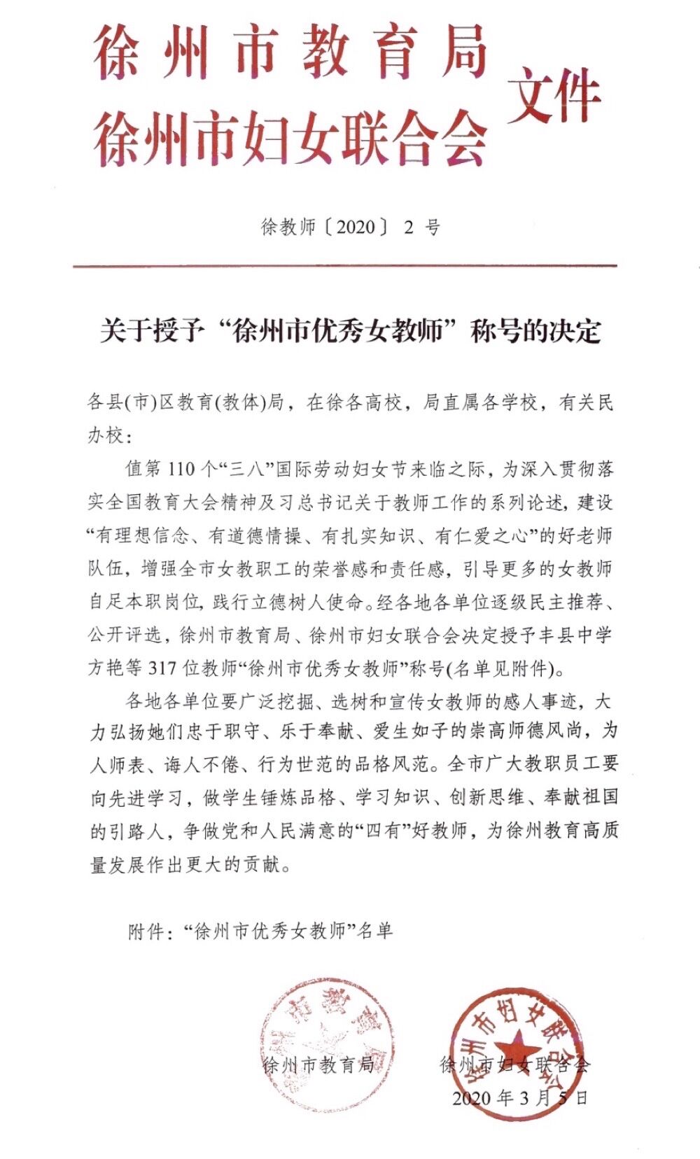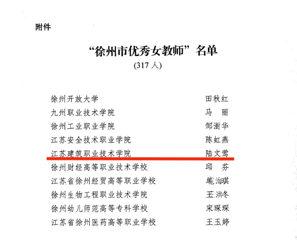 据悉,“徐州市优秀女教师”称号为徐州市教育局、徐州市妇女联合会为增强全市女教职工的荣誉感和责任感,引导更多女教师自足本职岗位,践行立德树人使命,为徐州市教育事业作出更大的贡献而设立,每一年评选一次,本次共授予317人。