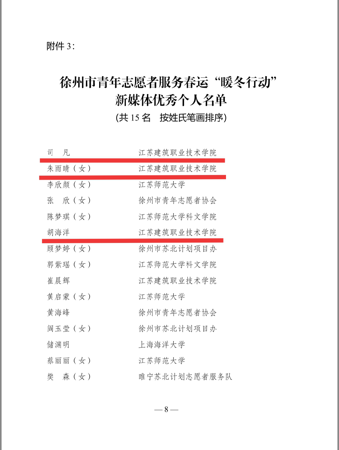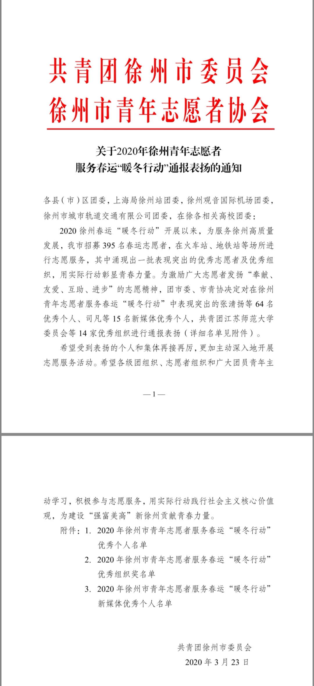 近日,在2020年徐州青年志愿者服务春运“暖冬行动”中,公司员工单旭旭、高嘉晨两名同学被团市委表彰为志愿服务春运“暖冬行动”优秀个人,司凡、朱雨晴、胡海洋等三名同学被表彰为志愿服务春运“暖冬行动”优秀新媒体个人。