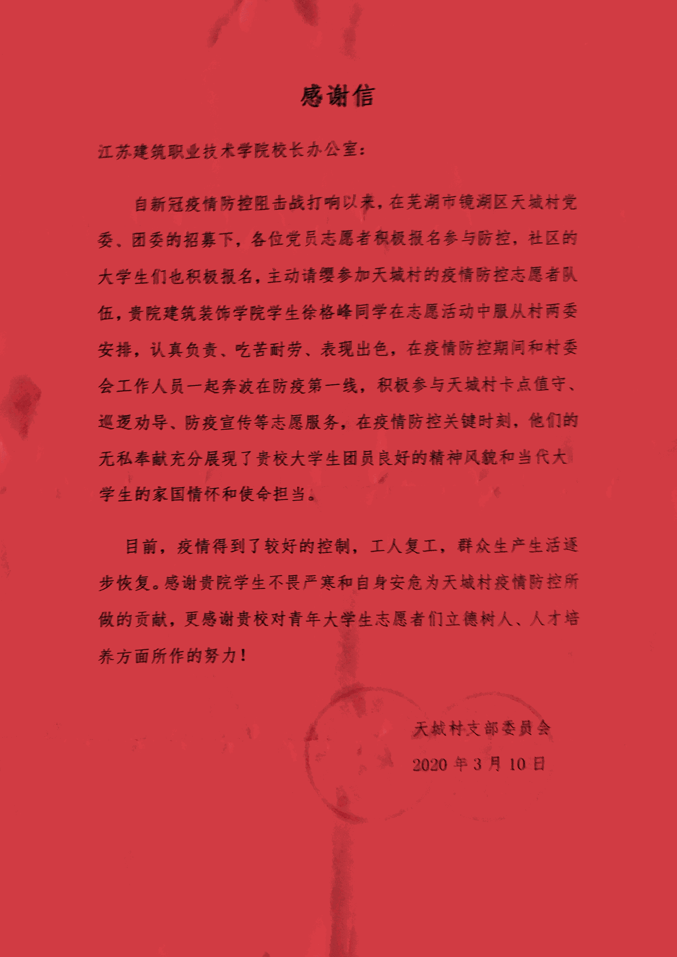 自防控防疫阻击战打响以来,公司环艺19-2班徐格峰同学在芜湖市镜湖区天城村社区,勇担青年团员使命与担当,积极响应当地团委号召,帮助村委成员排查来往车辆和行人,认真负责、吃苦耐劳,表现出色,在防控疫情关键时刻,展现了当代老员工团员的良好精神风貌和家国情怀,彰显新时代青年最美风采。