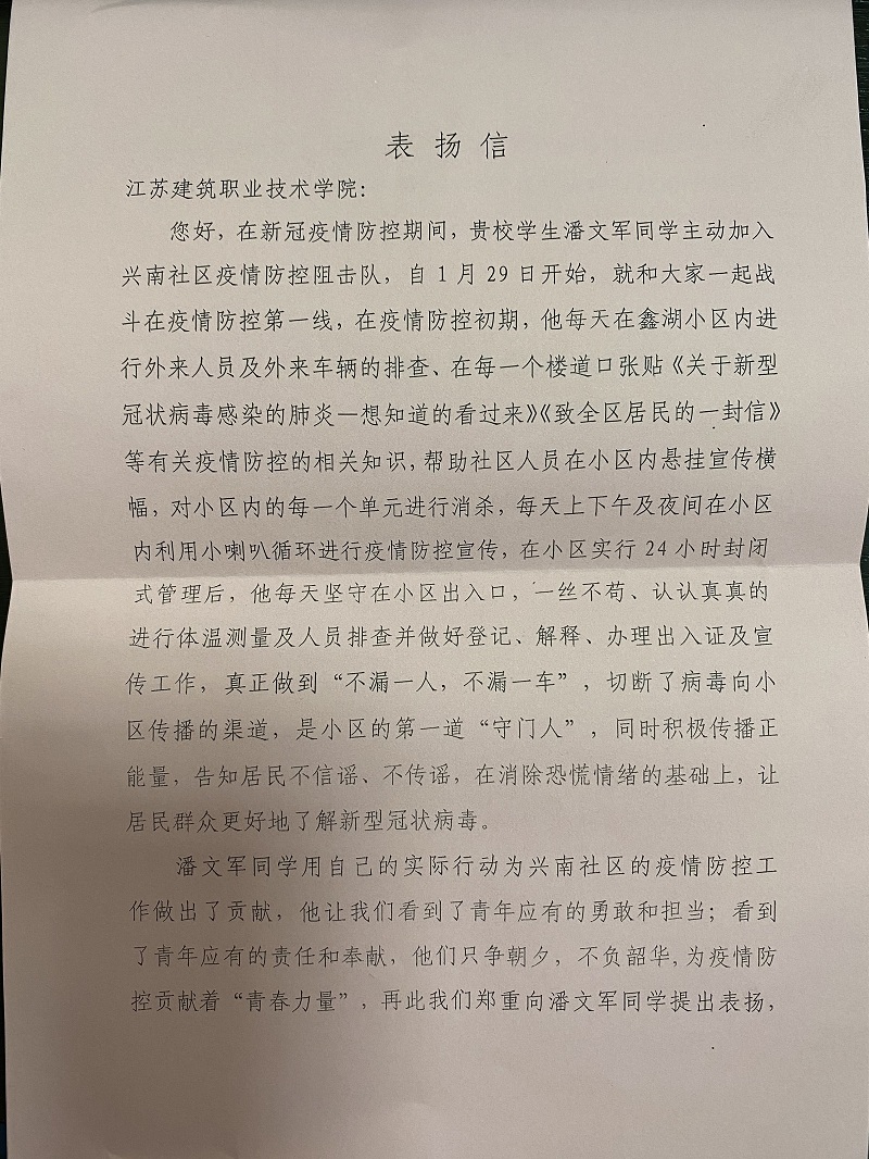 近日,公司收到泉山区段庄街道兴南社区居委会的一封表扬信,来信指出公司员工园林17-1班潘文军同学在防控疫情期间主动加入兴南社区疫情防控阻击队,用自己的实际行动为兴南社区疫情防控工作作出了贡献,展现了当代青年应有的担当和奉献精神,对公司能培养出如此优秀的员工表示感谢。