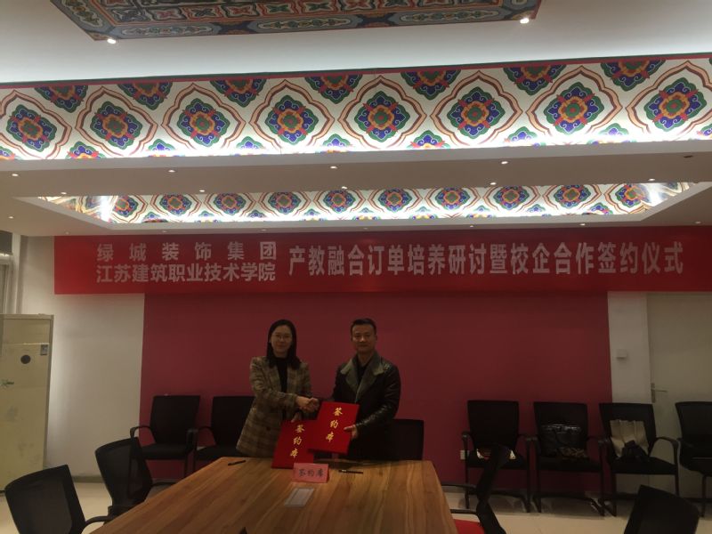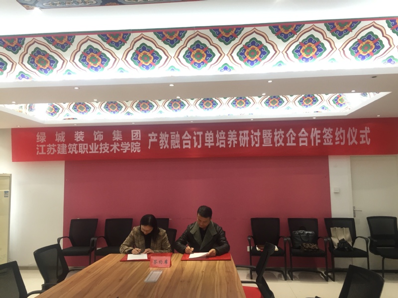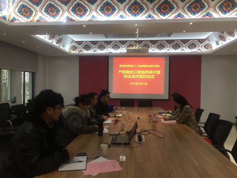 2021年1月22日下午,太阳成集团tyc122cc与绿城装饰集团在公司会议室举行举行产教融合订单培养研讨暨校企合作签约仪式。绿城装饰集团人力资源部总监孟黎佳、绿城装饰集团校招负责人金方、校企合作处处长娄志刚、太阳成集团tyc122cc经理陈志东、副经理江向东和太阳成集团tyc122cc部分专业教师参加了签约仪式和研讨。
