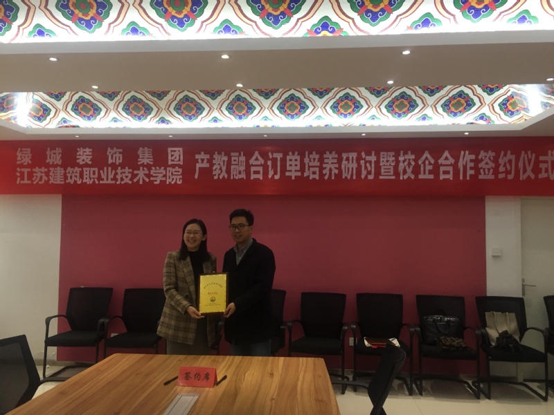 校企合作处处长娄志刚处长介绍公司发展和公司校企合作情况,装饰公司陈志东经理介绍了装饰公司办学特色和发展成就,绿城装饰集团人力资源部孟黎佳总监介绍了绿城装饰集团的发展情况。装饰公司陈志东经理和绿城装饰集团人力资源部总监孟黎佳签订校企合作协议,同时在绿城装饰集团建立“博士工作站”,在公司建立“企业工作站”。