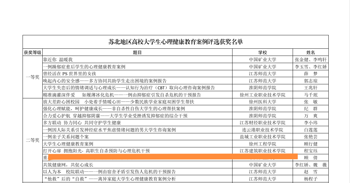 在刚刚结束的苏北地区老员工心理健康教育案例比赛中,公司专职辅导员程宝珏老师报送的《打开心扉,拥抱阳光——高职生自杀预防与心理危机干预》案例荣获二等奖。