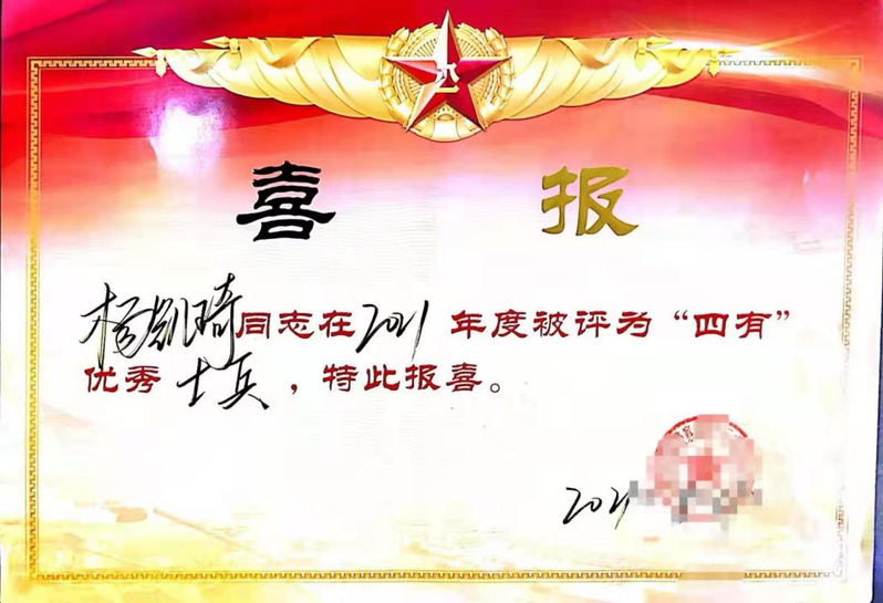 近日,公司收到一份来自中国人民解放军某部队送来的喜报,2019年参军入伍的装饰18-1班杨凯琦同志被评为2021年度“四有”优秀士兵。