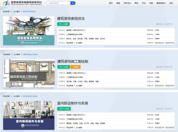 近日,国家高等教育智慧教育平台正式上线运行,公司陈志东老师主持的《建筑装饰表现技法》、陆文莺老师主持的《建筑装饰施工图绘制》和翟胜增老师主持的《室内陈设制作与安装》等3门课程入选。