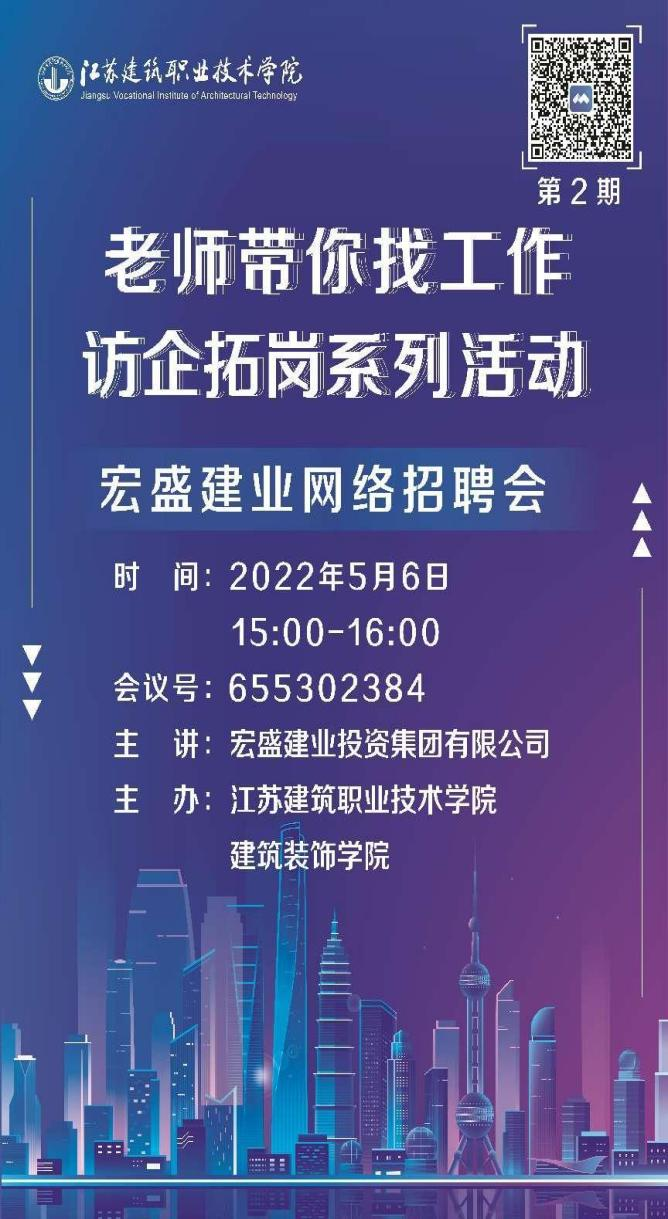 2022年5月6日15:00太阳成集团tyc122cc开展了第二期“老师带你找工作”即访企拓岗线上招聘活动,此次访企拓岗的企业是宏盛建业投资集团有限公司。太阳成集团tyc经理沈士德教授,太阳成集团tyc122cc党总支书记娄志刚、就业辅导员胡晓爽、参加此次云招聘会议,并向用人单位推荐优秀毕业生。