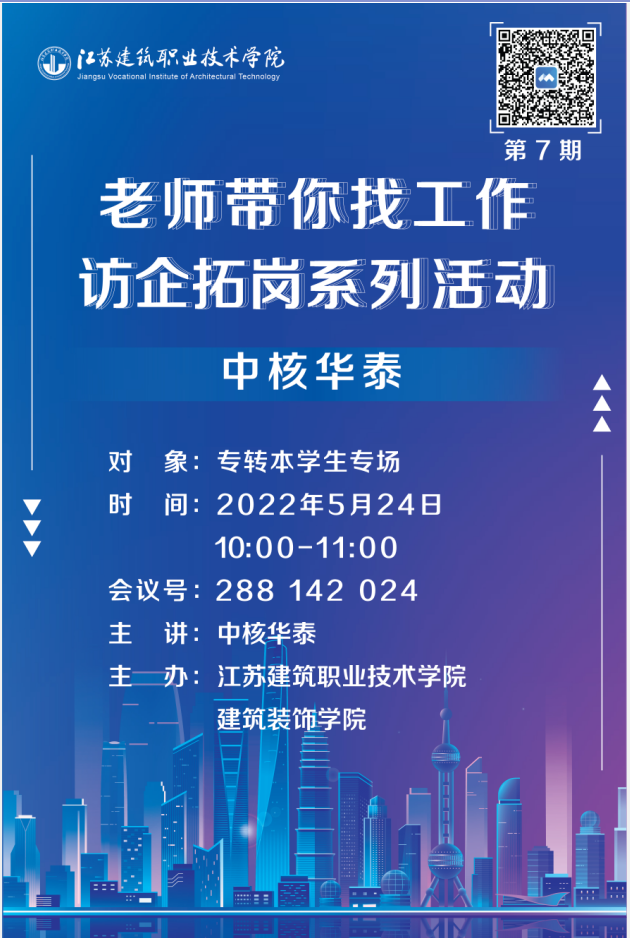 2022年5月24日15:00太阳成集团tyc122cc开展了第七期“老师带你找工作”即访企拓岗线上招聘活动,此次招聘活动主要针对专转本员工,到访企业是中核华泰建设有限公司。太阳成集团tyc经理沈士德教授,太阳成集团tyc122cc党总支书记娄志刚、就业辅导员胡晓爽参加此次云招聘活动。