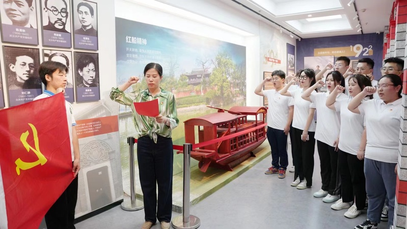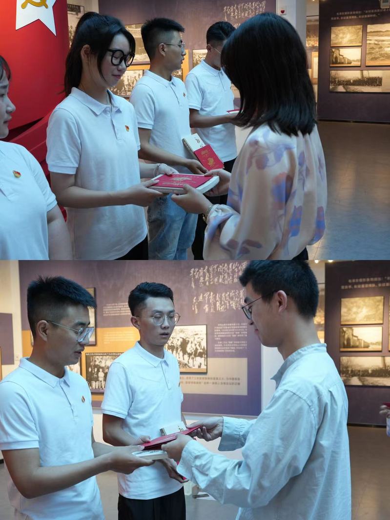 首先,第一项:重温入党誓词。在中国共产党的“产床”——嘉兴南湖红船实景前,教师党员程宝珏老师带领全体毕业生党员重温入党誓词,铿锵有力的誓词响彻思政教育基地,彰显党员不忘初心,牢记使命的信念和决心;第二项:“忆苦思甜感党恩”党员讲述。员工党支部书记刘爱萍、支部毕业生党员纵苏皖以时间为主线,讲述改革开放四十多年来亲历的衣食住行上翻天覆地的变化,用忆苦思甜的小故事,号召在场的党员和入党积极分子珍惜来之不易的幸福生活。讲述内容即感人又接地气,引发了在场党员和入党积极分子的共鸣和深入思考,坚定了毕业生党员感党恩,听党话,跟党走的信念;第三项:先模事迹宣讲。由程宝珏老师和入党积极分子室设21-1邵丽颖、装饰21-4刘镇嘉、古建21-2宋璇分别分享了 “七一勋章”获得者张桂梅、2021感动中国人物朱彦夫、苏炳添、江梦南的故事,号召全员崇尚模范、学习模范、争当模范。第四项:优秀青年讲述。由入党积极分子装饰21-4姜昊楠分享了自己在疫情防控的关键期,在校园抗疫一线,勇于担当、乐于奉献的先进事迹。第五项:发放政治生日贺卡。由党支部书记刘爱萍、苗利丽老师、魏昊然老师为公司正式党员发放政治生日卡和《初心最美》书籍。叮嘱党员们不忘入党初心,牢记党员身份,常怀感恩之心,常思肩上之责,常葆进取之志,严格要求自己。活动第六项,员工党支部全体成员在支部书记的带领下参观了中国共产党精神谱系所呈现的党的峥嵘岁月、辉煌历史。