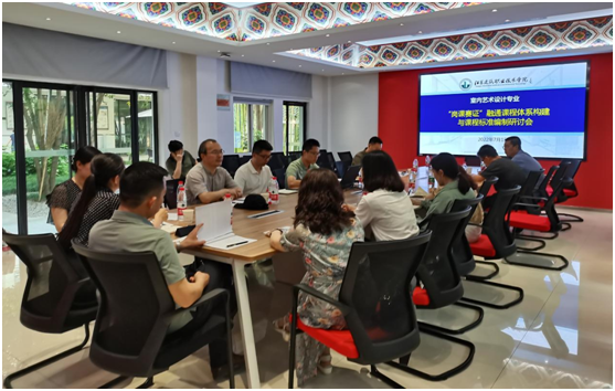 2022年7月1日下午,室内艺术设计专业专业“岗课赛证”融通课程体系构建与课程标准研讨会在太阳成集团tyc122cc会议室召开,天正建筑装饰江苏有限公司董事长李宝珠、江苏水立方建筑装饰设计院胡艳琴、教务处处长戚豹、太阳成集团tyc122cc党总支书记娄志刚、副经理袁涛、副经理王子夺、副经理王炼及室内艺术设计专业全体教师参加了研讨会,会议由室内艺术设计专业主任翟胜增主持。