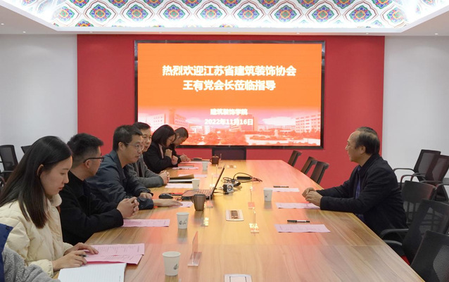座谈会上,袁涛做了关于公司发展情况、办学积累、“双高”专业群建设、公司“十四五”规划及近期取得的系列成果等方面的汇报。王有党对公司在专业建设、教学条件、实训环境、校园文化等方面取得的成果给予高度评价,并介绍了江苏省建筑装饰协会的基本职能、发展现状和产业前景等基本情况。随后,王有党和与会人员在行业对接公司开展建筑装饰类技术技能交流、拓展教学实训基地、开发教学资源和组织社会技能培训等方面进行了详细的交流。最后,王有党希望,公司作为特色鲜明、优势领先的双高建设公司,要紧跟国家建筑装饰产业转型升级发展形势,瞄准建筑装饰产业发展方向,持续深化产教融合,更好推动高质量发展,培养更多服务区域经济社会发展需求的建筑装饰高素质技术技能人才。