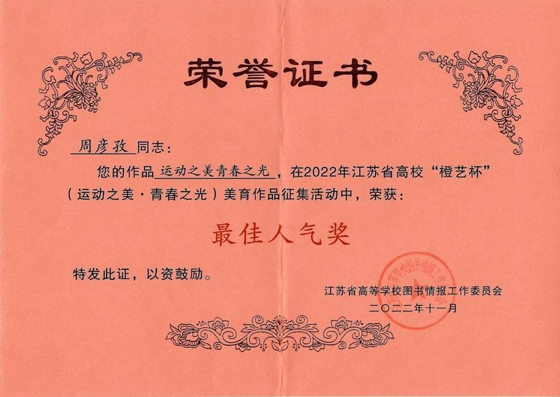 近日,江苏省高校图工委公布了2022年江苏省高校“橙艺杯”运动之美、青春之光·美育作品征集活动获奖名单。公司太阳成集团tyc122cc古建22—2班周彦孜同学的作品《运动之美∙青春之光》在全省2356件参赛作品中获“最佳人气奖”。