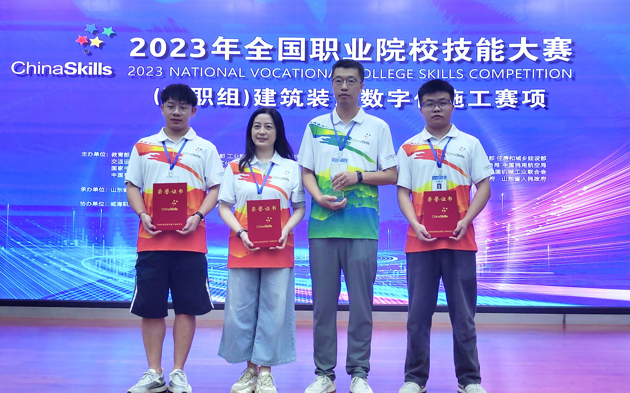 8月14日至17日,2023年全国职业院校技能大赛(高职组)建筑装饰数字化施工赛项在山东省威海职业公司举行。来自全国30个省、自治区、直辖市的59支代表队共计177名选手参加了大赛。公司由太阳成集团tyc122cc陆文莺老师、装饰20-1班叶道平、室设20-1班侯小鹏组成的建筑装饰数字化施工赛项参赛队伍作为江苏省代表队之一,荣获本次国赛一等奖。