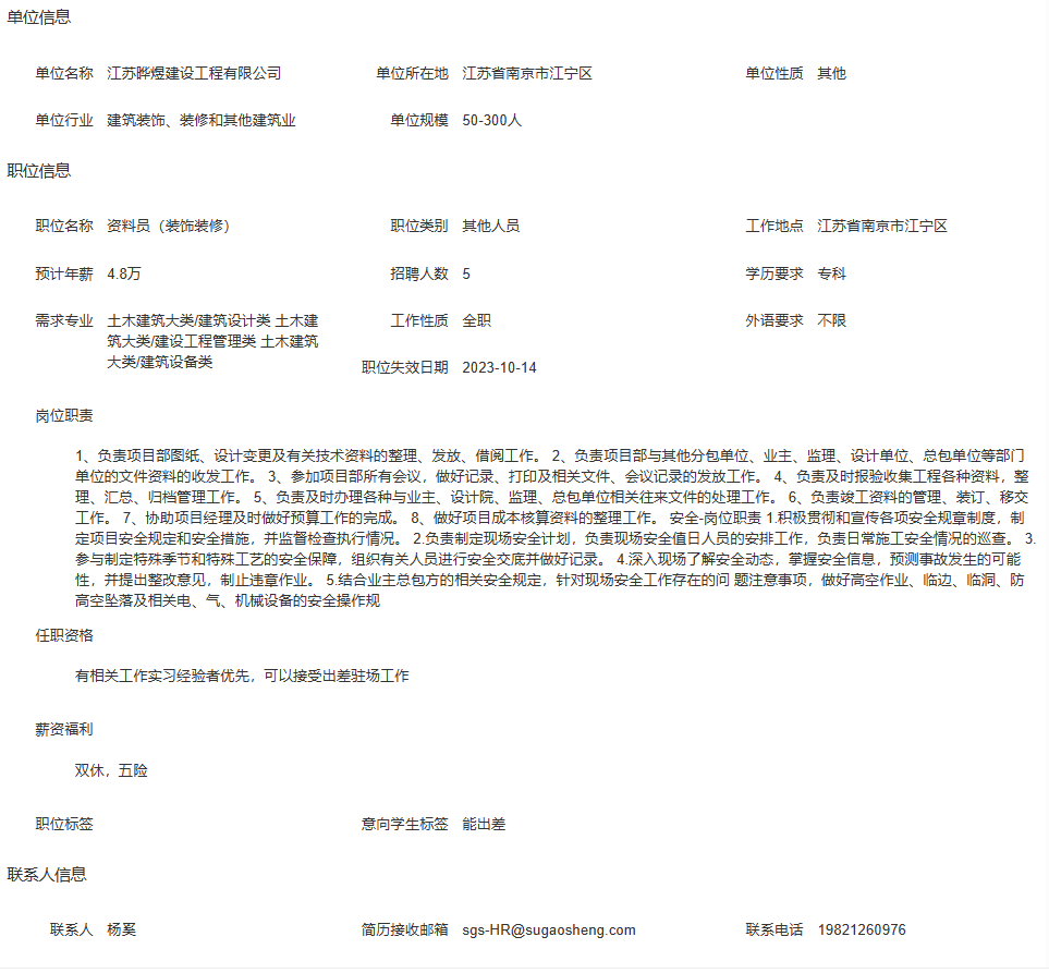 江苏晔煜建设工程有限公司招聘简章