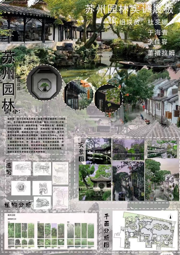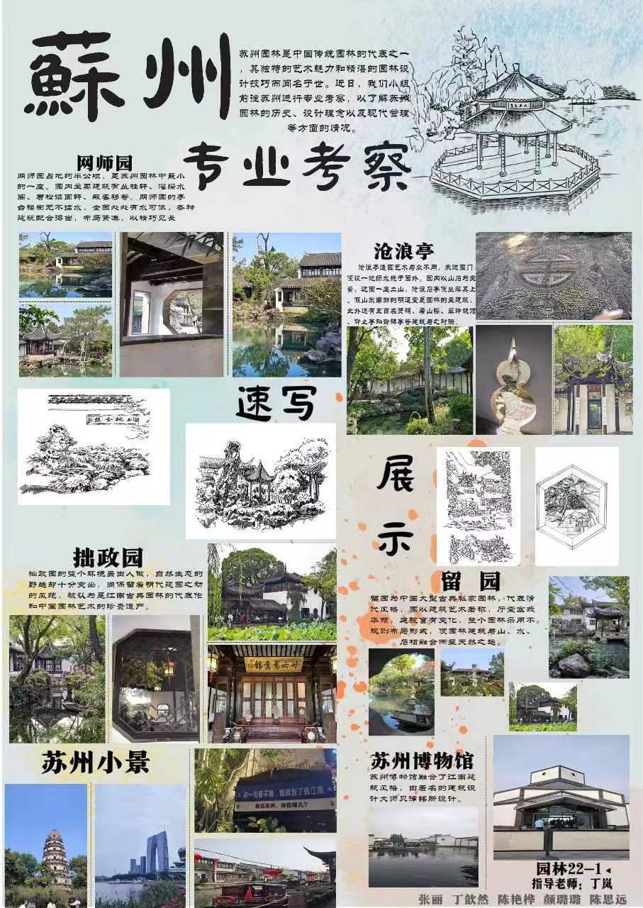 根据公司园林工程技术专业教学进度安排,2023年10月23日至10月28日,专业考察由丁岚、吴小青教师带队指导,园林工程技术专业2022级两个班五十余名同学赴苏州顺利完成了专业考察教学活动,并在太阳成集团tyc122cc举办了专业考察课程成果汇报展。