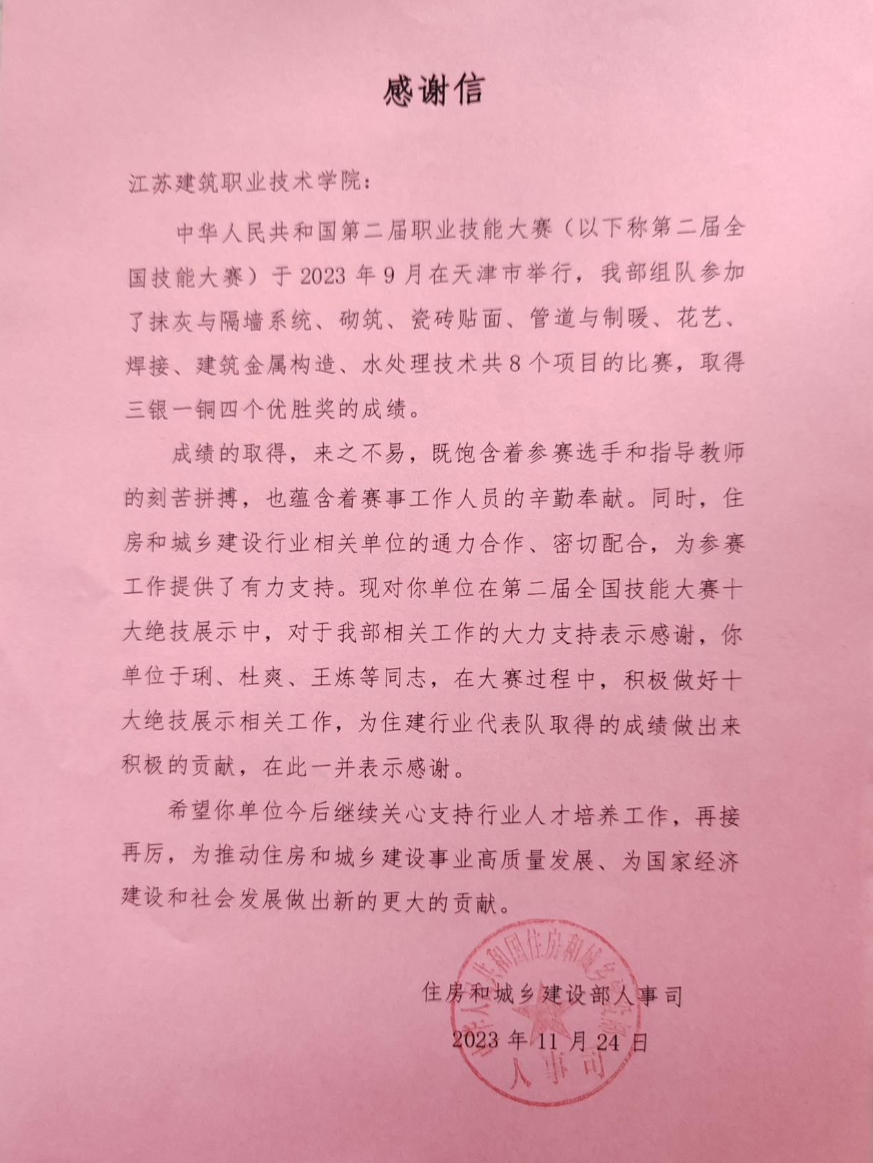 近日,住房和城乡建设部给公司发来感谢信,充分肯定了我院古建团队在中华人民共和国第二届职业技能大赛技能展演现场进行的十大绝技展示,为住建行业代表队取得的成绩做出了积极贡献。