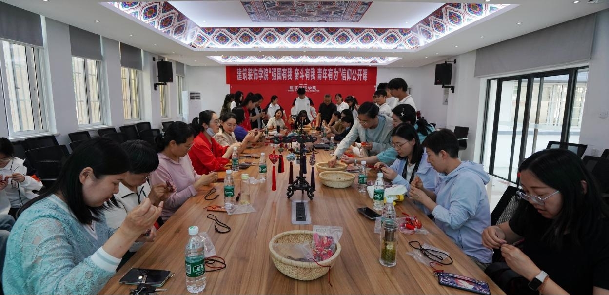 最后,孙歌尧分享了自己的非遗传承之路及青春成长故事。详细介绍了自己在祖孙齐心传非遗、弘扬民族文化、增强民族自信等方面所做的努力和实践探索。同时,她从自己助力农旅,唱响乡村振兴最强音;创新香包设计,积极助力当地全域乡村旅游融合,推动香包小镇新发展;担任“非遗进校园”宣讲大使并在全国各地开展数百场红色宣讲活动;参加中国共产主义青年团第十九次全国代表大会,在人民大会堂近距离聆听党中央领导的谆谆教诲等经历讲述,勉励青年学子珍惜青春韶华,找准奋斗方向,将自己的青春与国家、民族、社会发展联系起来,铸牢信仰,让青春在奋斗中焕发光彩。装饰公司师生们在孙老师的精彩故事讲述中共同上了一堂生动的思政课。