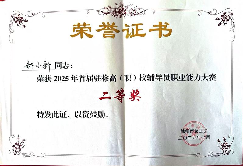 近日,由徐州市总工会主办,徐州市教育工会、中国矿业大学工会联合承办的2025年首届驻徐州高等院校(职校)辅导员职业技能大赛决赛在中国矿业大学举办,公司专职辅导员郝小新获大赛二等奖。