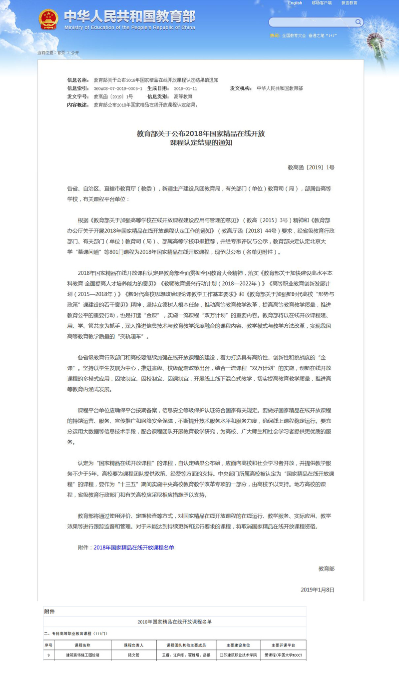 1月8日,教育部发布了《关于公布2018年国家精品在线开放课程认定结果的通知》(教高函【2019】1号),公司陆文莺老师主持的《建筑装饰施工图绘制》课程认定为2018年国家精品在线开放课程。